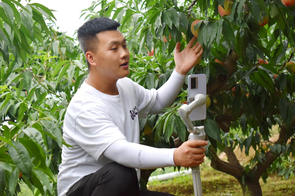 7月27日至28日,服务队成员们深入田间地头,帮助果农采摘新鲜蜜桃,并与果农们进行了亲切 地交流,了解蜜桃种植情况。同时,在桃园里搭建了专业的直播设备,主播们手持鲜红的蜜桃,生动形象地介绍着秦洼村的农产品特点和优势,向镜头前的观众详细介绍秦安蜜桃的种植环境、独特口感及营养价值,吸引了大量网友的关注和购买。