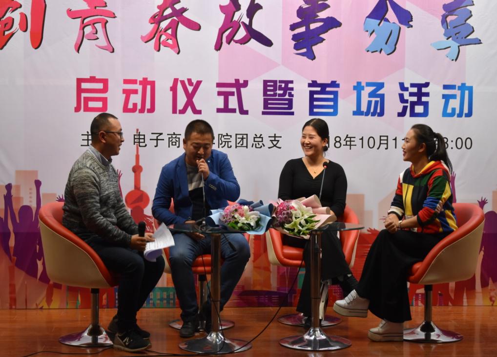 本次活动分为两个半场,主题分别为创业青春和恰同学少年。在创业青春板块,赵武强、魏菲利、高海波三位电商创业者分别分享了自己的创业过程,他们真诚的分享深深地打动了台下认真聆听的同学们。随后,高鹏就创业初心、创业挫折等几个关键词对话三位嘉宾,使同学们深刻地意识到创业过程中选择、坚持和创新的重要性。在恰同学少年板块,杨花、陈瑞回忆了在公司求学时的青葱岁月,并就如何充实地度过大学三年时光、本地和外地实习就业的差别、如何快速适应公司到职场的转变等方面给予了台下同学们很多的启示。