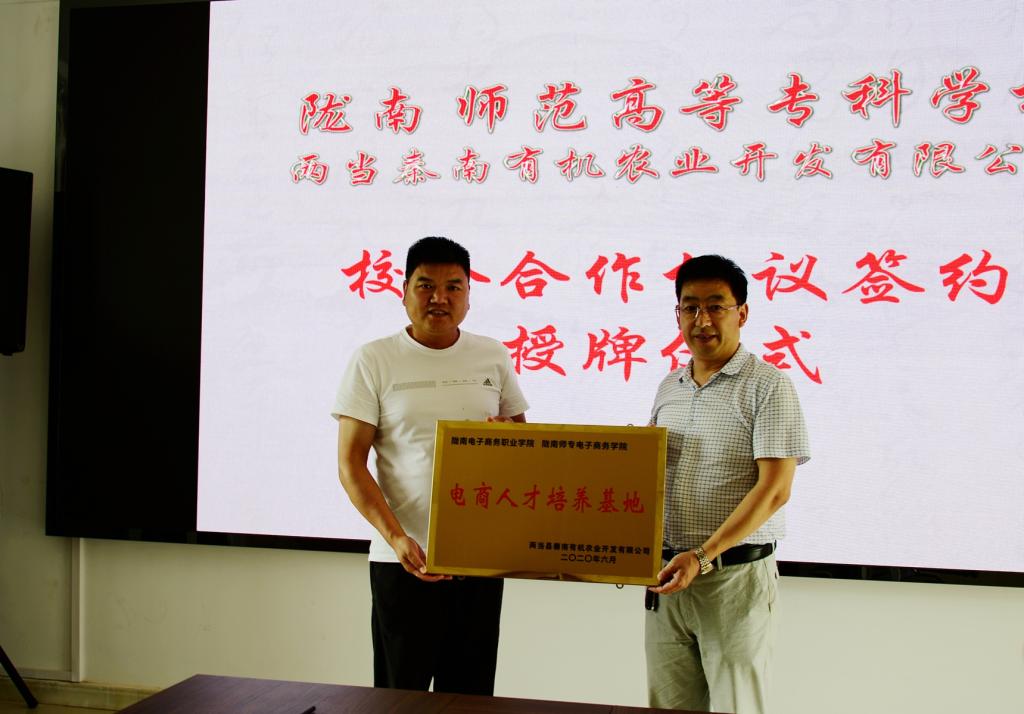 在两当县电商中心主任李亮、两当秦南有机农业开发有限公司董事长蒋宇仁的陪同下,镡旭东参观了企业无菌化蜂蜜生产线和电子商务展厅,详细了解了企业发展情况,该公司是核桃油、狼牙蜜、亚麻油、食用菌等产品专业生产加工的公司,拥有完整、科学的质量管理体系。随后,举行了陇南师范高等专科公司与秦南有机农业开发有限公司校企合作签约仪式,镡旭东向两当秦南有机农业开发有限公司授“老员工电商就业创业实践基地”牌,蒋宇仁向公司授“电商人才培养基地”牌。