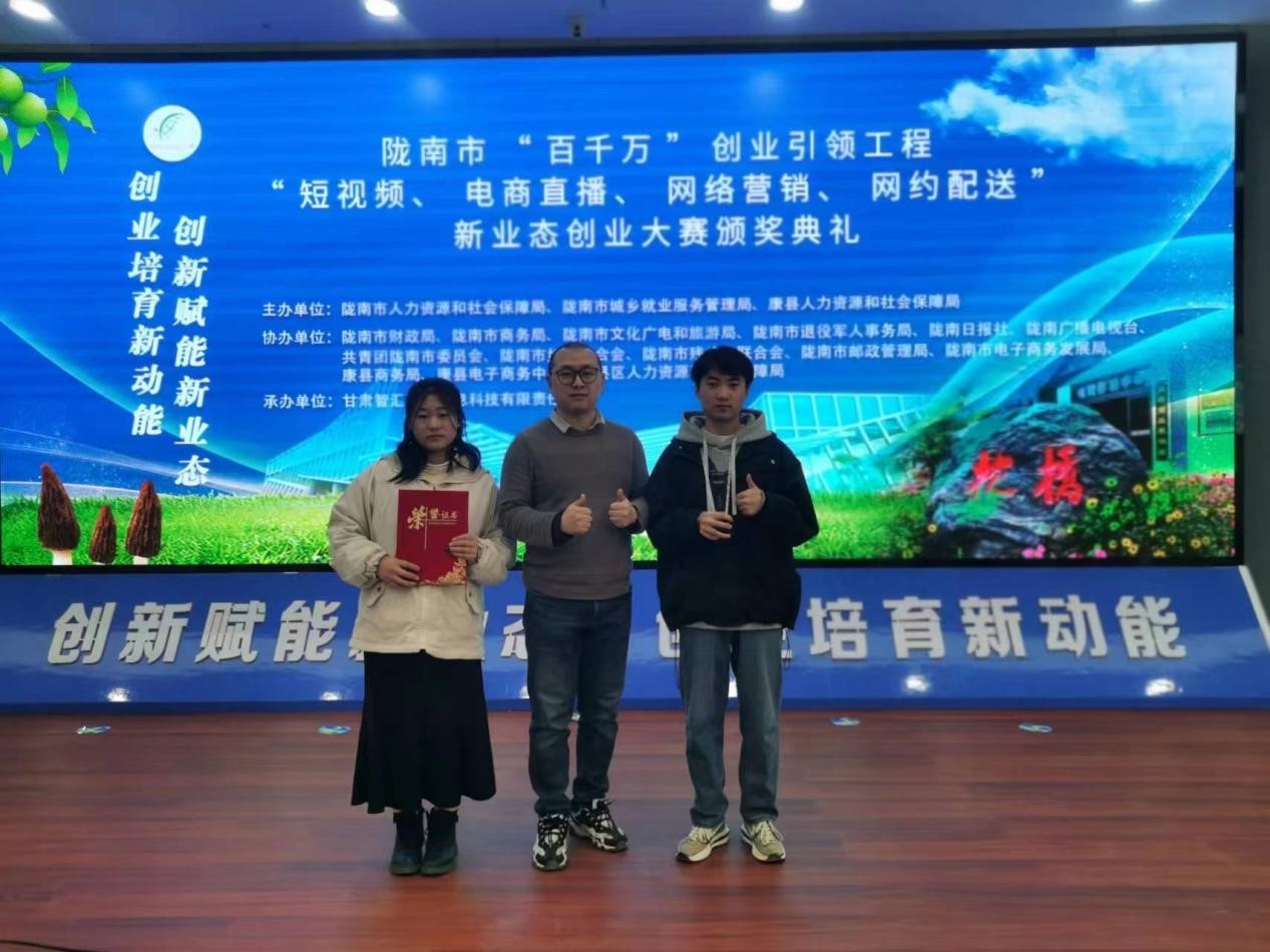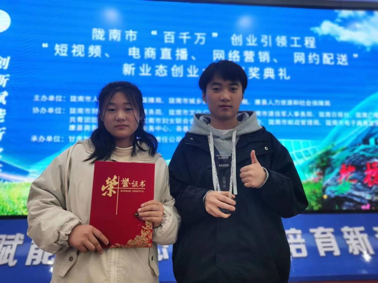 2月24日,公司员工21级电商1班罗娟、电商2班张昊及其带队教师高鹏在由陇南市人社局主办的“百千万”创业引领工程“短视频、电商直播、网络营销、网约配送”新业态创业大赛荣获“电商直播”赛项三等奖。