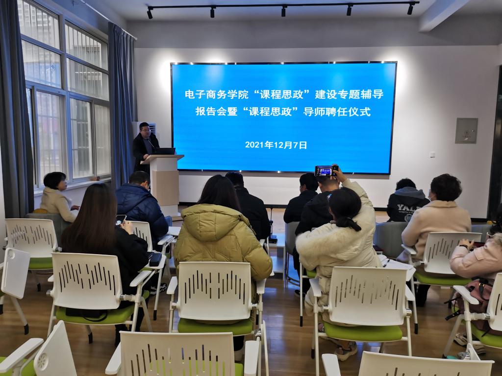 报告会前,党总支书记高峰为豆学兰颁发了课程思政建设导师聘书。豆学兰副教授以“做好课程思政,落实立德树人”为题,从对课程思政的科学认识、课程思政建设的实践举措、课程思政建设中要处理好的几个问题等方面进行了讲解。她表示,课程思政不是生拉硬套将思想政治教育内容嫁接在专业课程上,专业课教师在设计课程思政教学内容时要自然地将思政元素融合在课程中。教育者先受教育,每一位专业课教师应坚持立德树人根本任务,不断提升自身综合素质。教师的敬业奉献、严谨治学、求真务实、仁爱员工等都是课程思政的体现,员工将会从教师身上感受到无形的思想政治教育的力量。最后,豆学兰副教授针对电子商务基础课程思政的内容设计提出了建议,在向员工传授知识和技能的同时树立正确的价值观,以达到润物细无声的效果,从而实现育人目标。