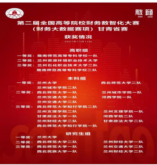 2021年11月12日,由兰州财经大学承办的第二届全国高等院校财务数智化大赛甘青省赛受疫情影响在线上举办,本次比赛分为甘青两省研究生、本科和高职三个组别。竞赛内容顺应中国数字经济发展新趋势、紧跟产业数字化转型的新步伐,要求参赛选手在数字商业环境中,熟练应用网络爬虫、可视化分析、数据挖掘等大数据技术解决财务问题的能力,以理论+实践双环节进行竞赛,比赛形式包括上机考试、提交成果物和现场答辩三部分,竞赛时长为1周。