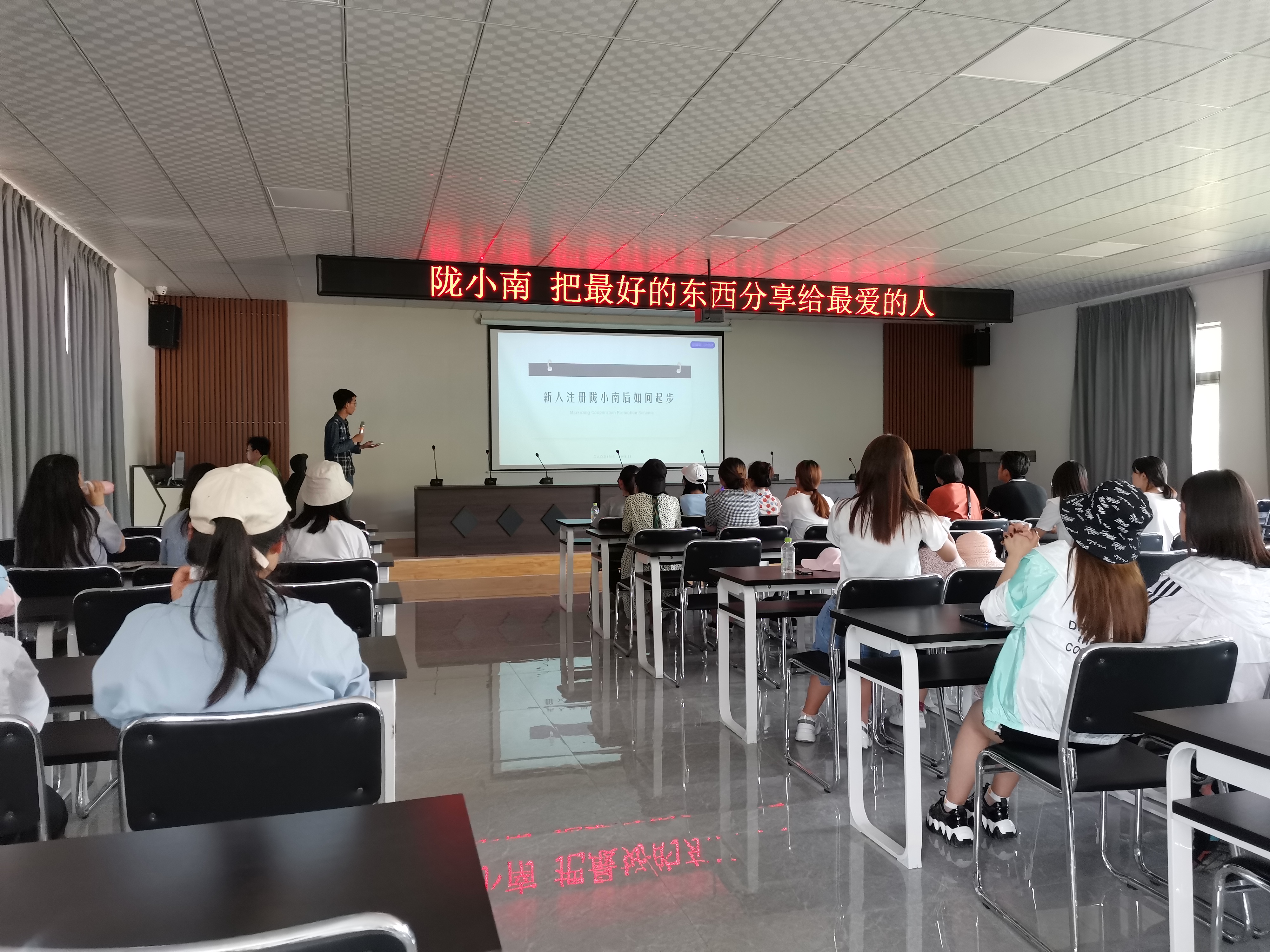在陇小南的报告厅,销售部负责人任晶涛作了一场“电商营销实列”报告,围绕《新人注册陇小南如何起步》、陇小南合伙人案例、发展历程、模式优势、创始人初衷等多方面课程进行详细讲解。讲解中既有对零售业态的解析,模式理念的更新,又有实际的操作,内容丰富实用,让同学们更加直观的了解掌握了陇小南合伙人、代理模式和平台的运用。同学们也对陇小南有了更深入的理解和认识,同时,也加深了校企间的合作交流,激发了员工对于农产品电商的学习兴趣和创新意识。